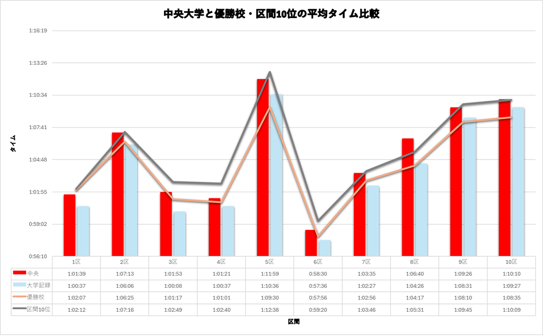 最後に、区間平均タイム・大学記録・優勝校タイム・区間10位タイムの比較を見ていきます。