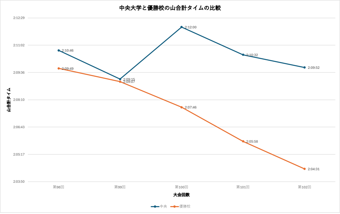 今回提示された山合計タイム(5区+6区)の推移は、中央大学の課題を最も端的に示しています。