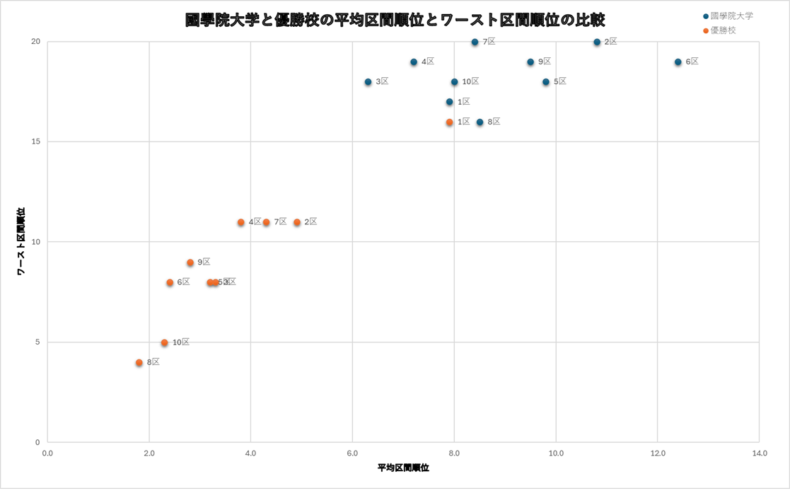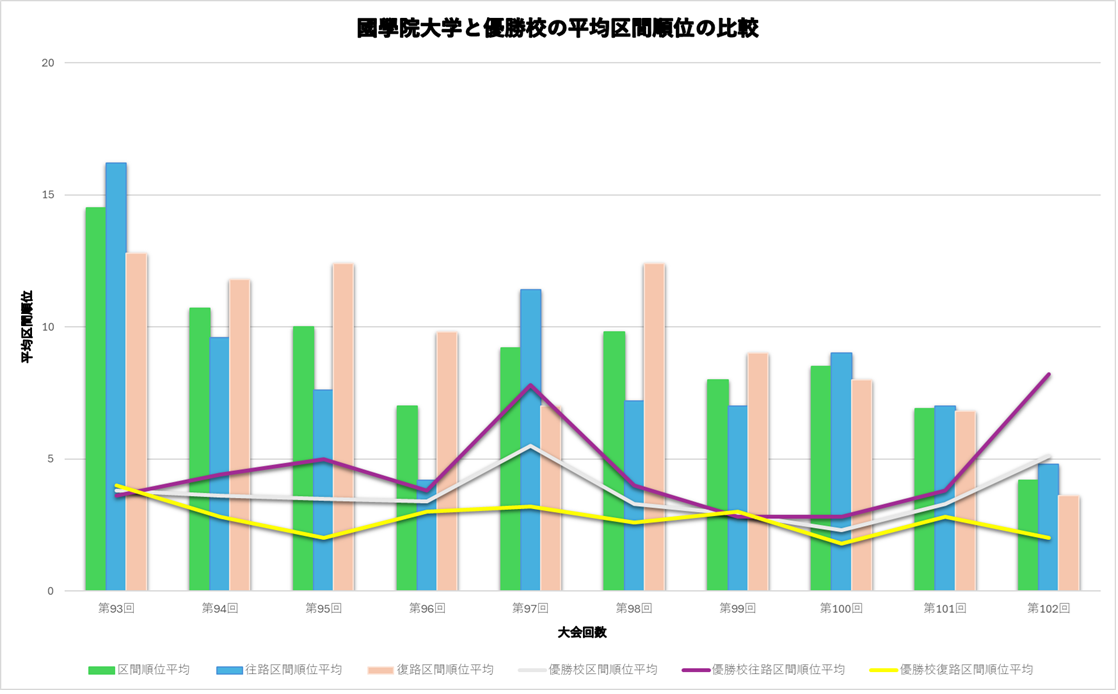 一方、國學院大学は、徐々に平均区間順位が安定してきているものの、優勝校には及ばない状態であった。しかし、第102回大会では2位ではあったものの、優勝した青山学院大学より、総合10区間と往路での平均区間順位上回ることができました。