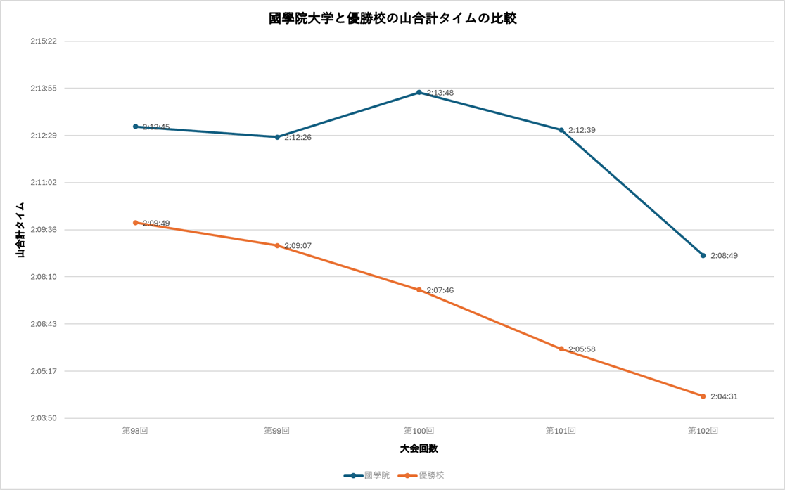 國學院大学と優勝校の山合計タイム推移を見ると、この差は非常に明確になっています。