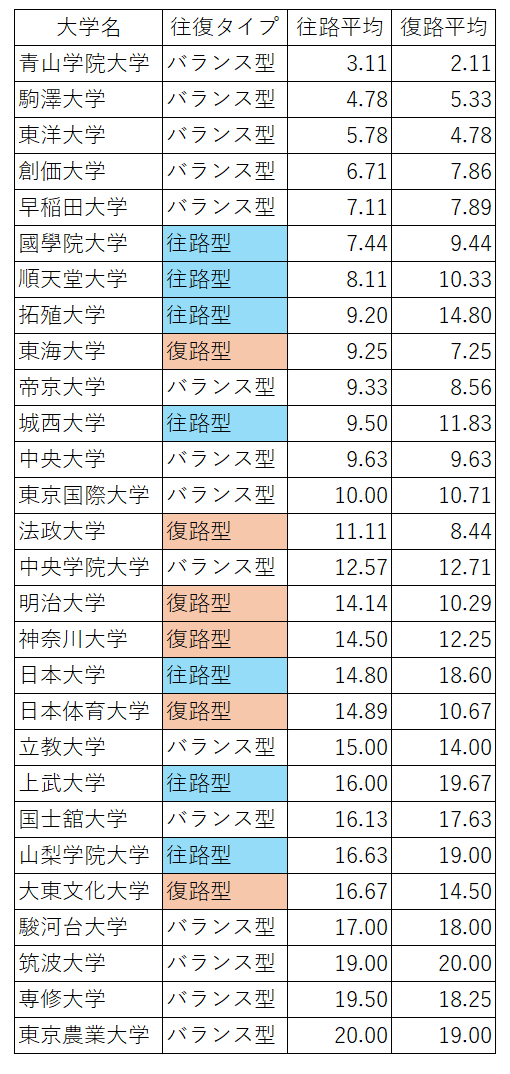 ・往路順位 < 復路順位 → 往路型