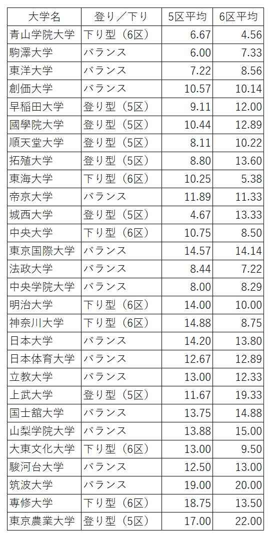 このように見ると、各大学がどの区間で勝負しやすいのか、また、どの区間が課題になりやすいのかが比較的明確になってきます。
