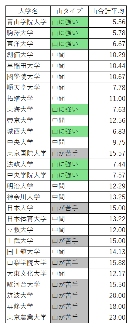 予想を目的とするものではないですが、各大学のタイプを把握することで、レース展開をより立体的に見ることができるのではないかと思います。