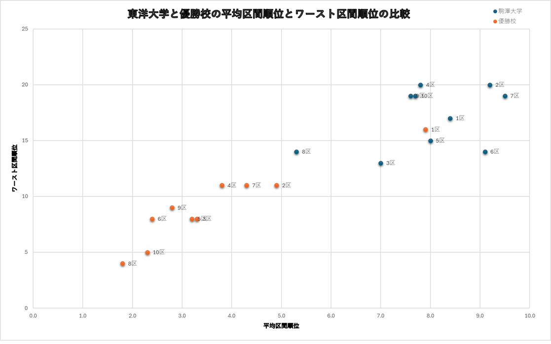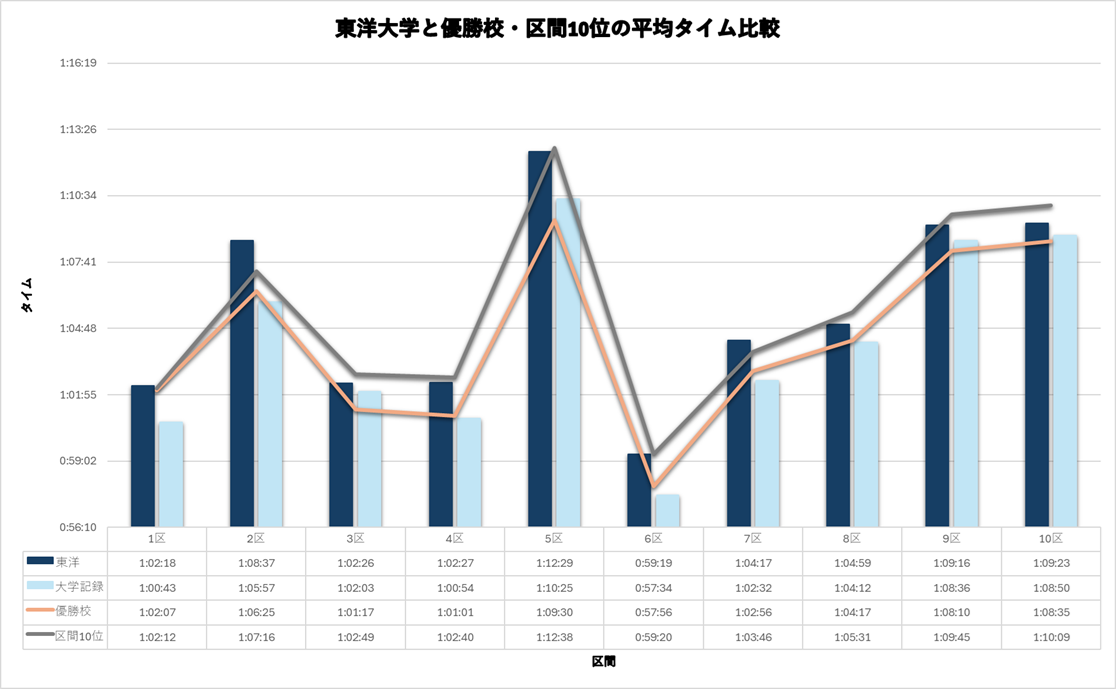 東洋大学の平均区間タイムは、区間10位平均を下回る区間が発生しています。