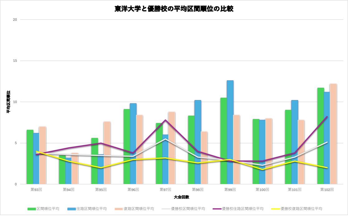 次に、東洋大学と優勝校の平均区間順位の比較を見ていきます。