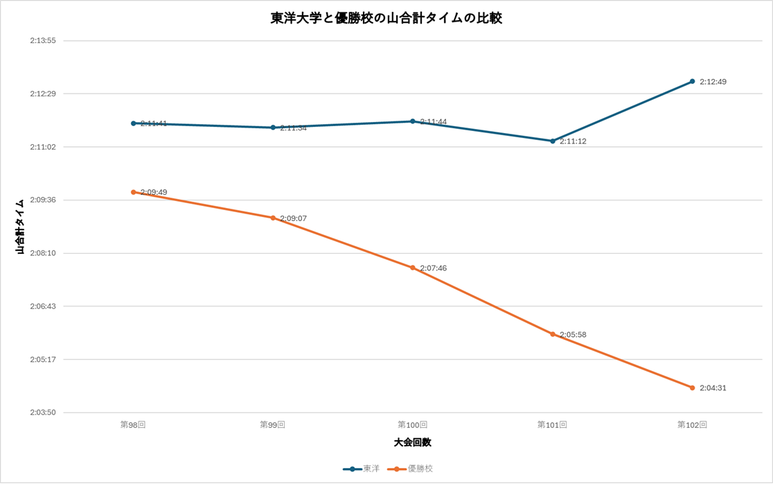 山合計タイムの比較を見ると、直近5大会において東洋大学は優勝校から毎年一定以上の差をつけられています。