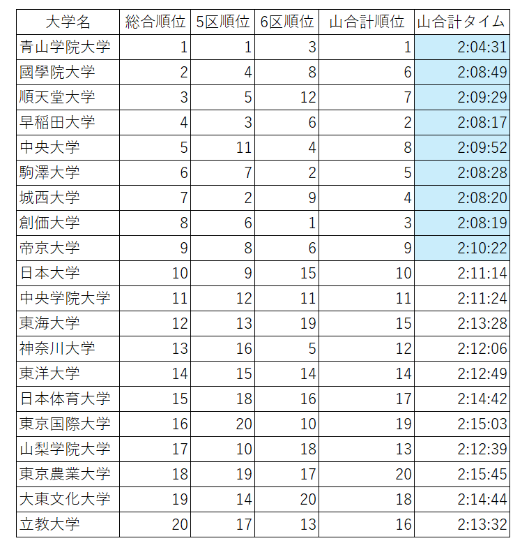 山区間(5区・6区)の強さは総合順位に直結したのか