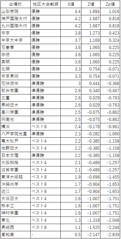 まず、山梨学院はS値4.4、Z値1.894と、今大会内では明確に最上位に位置しています。
