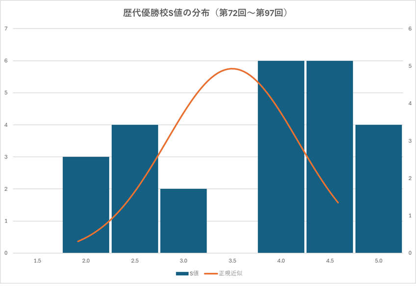 本来、水準比較を行うなら、過去大会の「全出場校S値分布」も同様に算出し、同じ母集団同士で比較する必要があります。