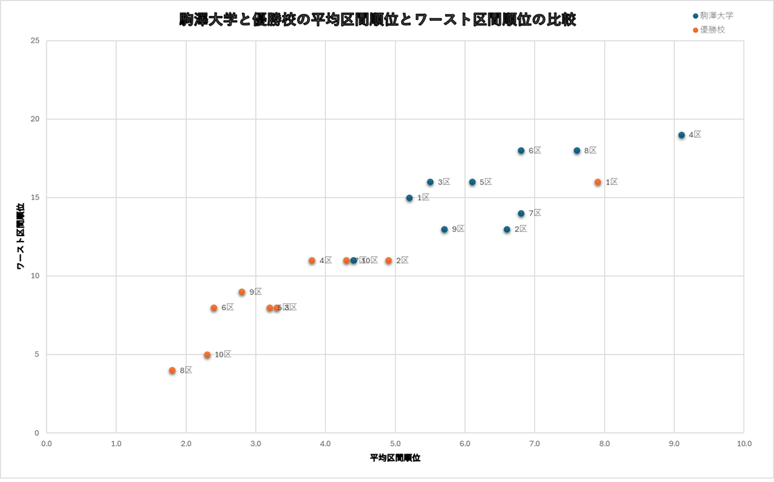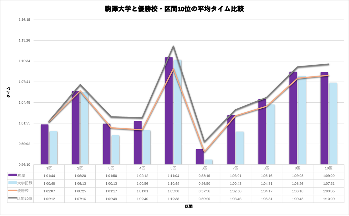 駒澤大学の平均区間タイムは、全区間で区間10位平均を明確に上回っています。