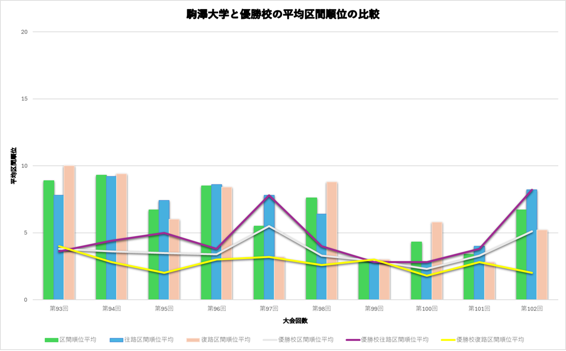 ここで浮かび上がるのは、駒澤大学が第97回大会以降は多くの区間で優勝校とほぼ同水準にあるという事実です。